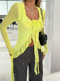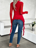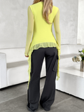 U-neck lace mesh long-sleeved top
